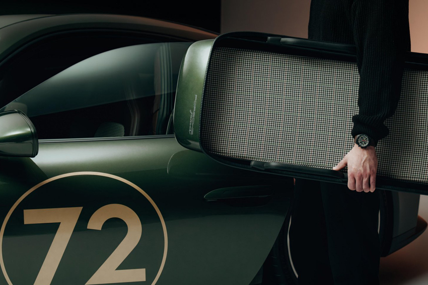 La voiture sera livrée avec un sac de week-end de même type que le véhicule. Il est composé de cuir de teinte brun truffe avec des coutures décoratives Beige Calcaire. Il est doublé de tissu Grid-Weave F.A., le même utilisé sur les bandes centrales des sièges tandis que le compartiment principal est revêtu de microfibre haut de gamme. La plaquette portant le logo anniversaire qui est apposé sur la grille du capot arrière est brodée sur la poche extérieure du sac de voyage.
